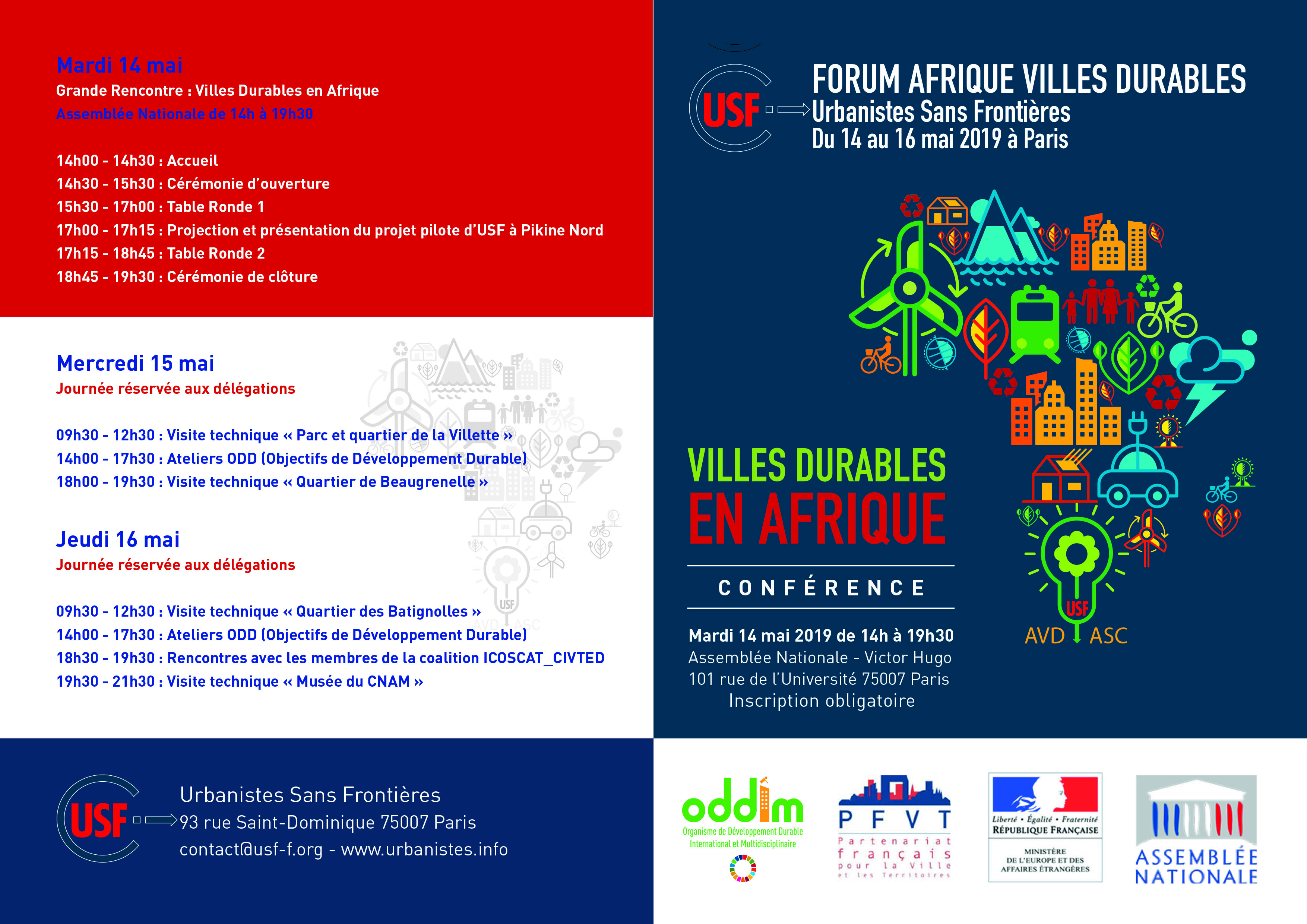 L’ONG Urbanistes Sans Frontières (USF) organise une grande rencontre « Villes Durables en Afrique ». Cet événement s’inscrit dans le cadre de la préparation du Sommet Afrique-France 2020 sur la ville durable. Vous pouvez télécharger le programme Forum AVD Paris mai 2019 flyer